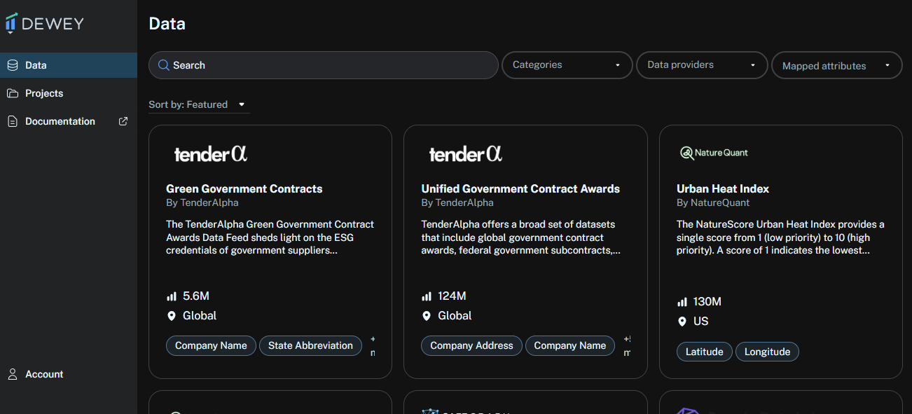 Dewey Data is a company with a large selection of datasets, that are excessible without the hassle that many researchers and data analysts face of getting individual data licenses and even finding datasets in that are well documented and maintained. They have created an environment where data filtering and exploration has been catered to the individual or group using it. They strive to have a wide variety of datasets that allow users to research and download data collected across many companies, that range from weather and temperature data, all the way to consumer data, and much more. Because of this, and their collaberation with Brigham Young University Idaho, they are a great resource for students to extract, experiment with, analyze the data, especially for classes in the data science and statistics departments.