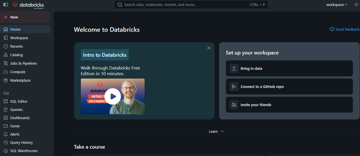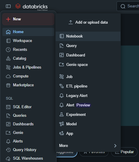 Additionaly, when using it from that point, if you would like to start a blank project, go to the top left corner, and click on the rounded rectangular icon next to the databricks logo. This will open up a side menu. Click on the option that says, + New and then in the secondary sidemenu that gets opened click on the Notebook button. Now you are ready to start your first project